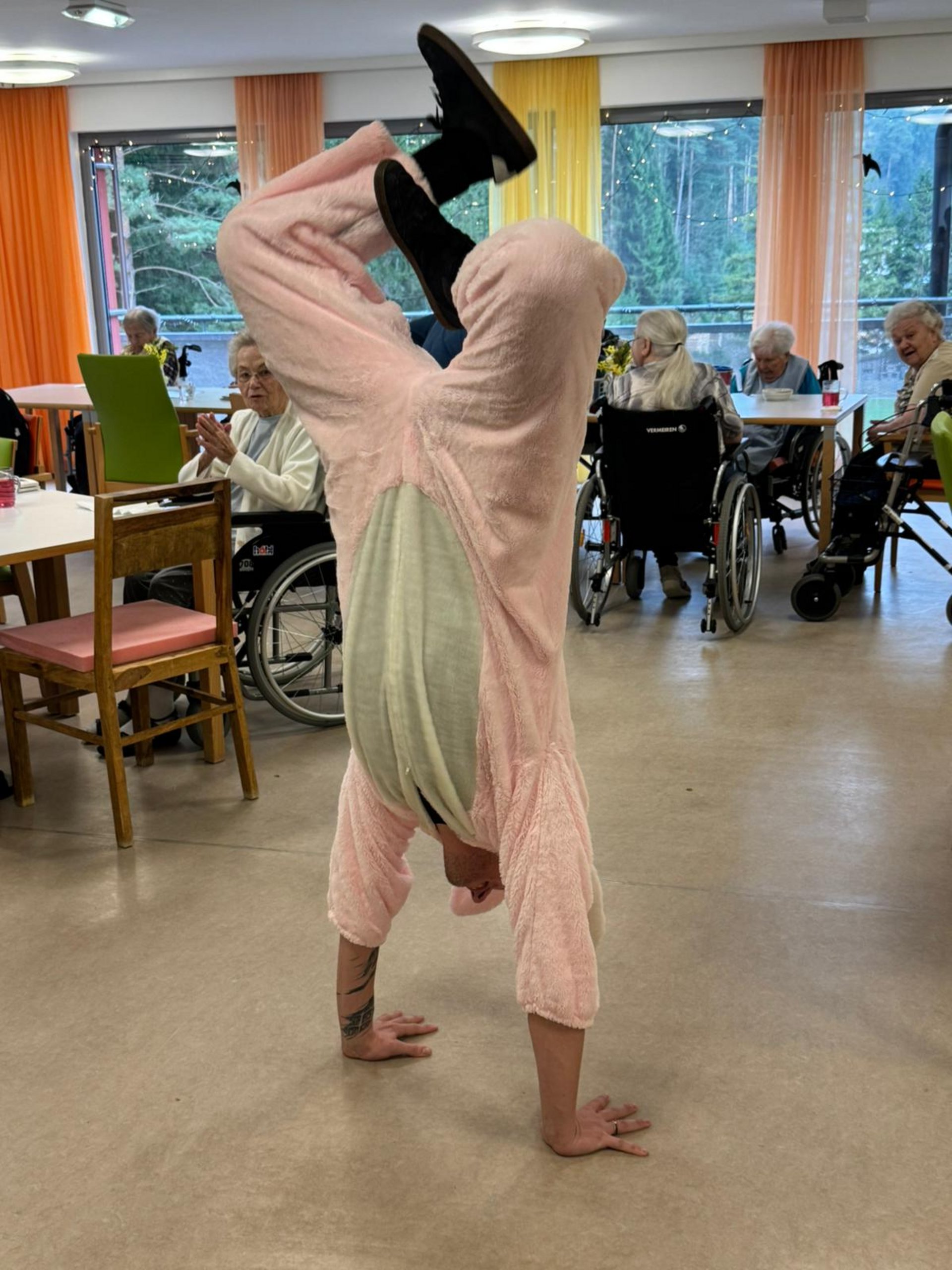 Ein Highlight war der Osterhase im rosa Fell, der mit einer akrobatischen Einlage für Staunen sorgte. Mit einer eindrucksvollen Handstand-Vorführung bewies er nicht nur Geschicklichkeit, sondern auch, dass der Osterhase einiges an sportlichem Talent mitbringt.