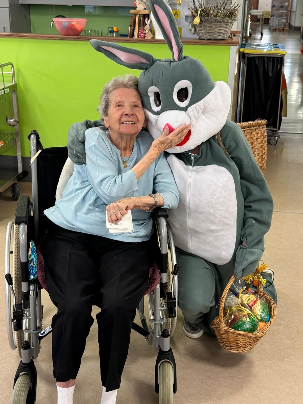 Natürlich durfte auch das traditionelle Verteilen von bunten Ostereiern und süßen Schoko-Osterhasen nicht fehlen. Mit viel Herzlichkeit überreichten die beiden Osterhasen kleine Aufmerksamkeiten und zauberten den Bewohnerinnen und Bewohnern ein Lächeln ins Gesicht.