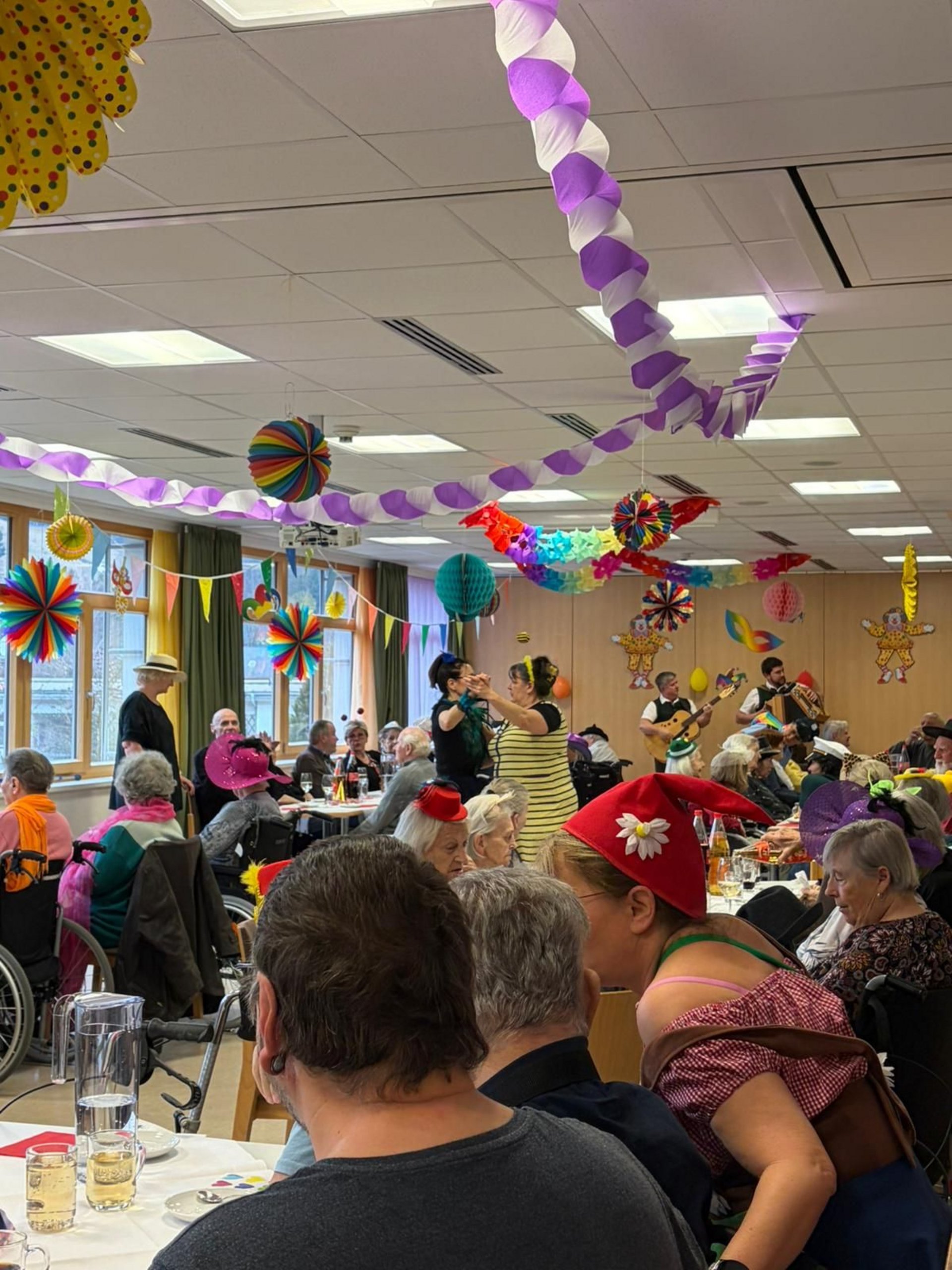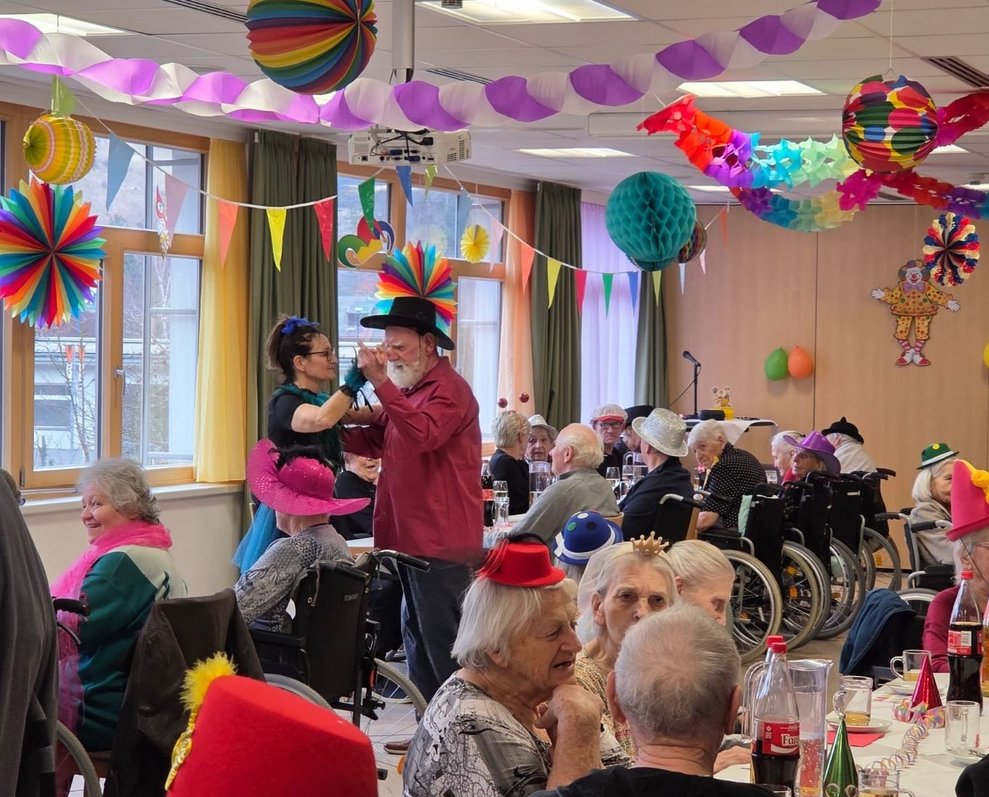 Am Nachmittag erwartete die Bewohnerinnen und Bewohner ein ganz besonderer Besuch, der mit einer großartigen Aufführung für Begeisterung sorgte und den Festtag zusätzlich bereicherte. Den krönenden Abschluss bildete eine humorvolle Darbietung der Alltagsbegleitung Olga Lepkowicz gemeinsam mit der Verwaltung, die mit einer schwungvollen Einlage im ABBA-Stil für viele Lacher und tosenden Applaus sorgte. Es war ein rundum gelungener Faschingstag voller Musik, Freude und wertvoller gemeinsamer Momente.